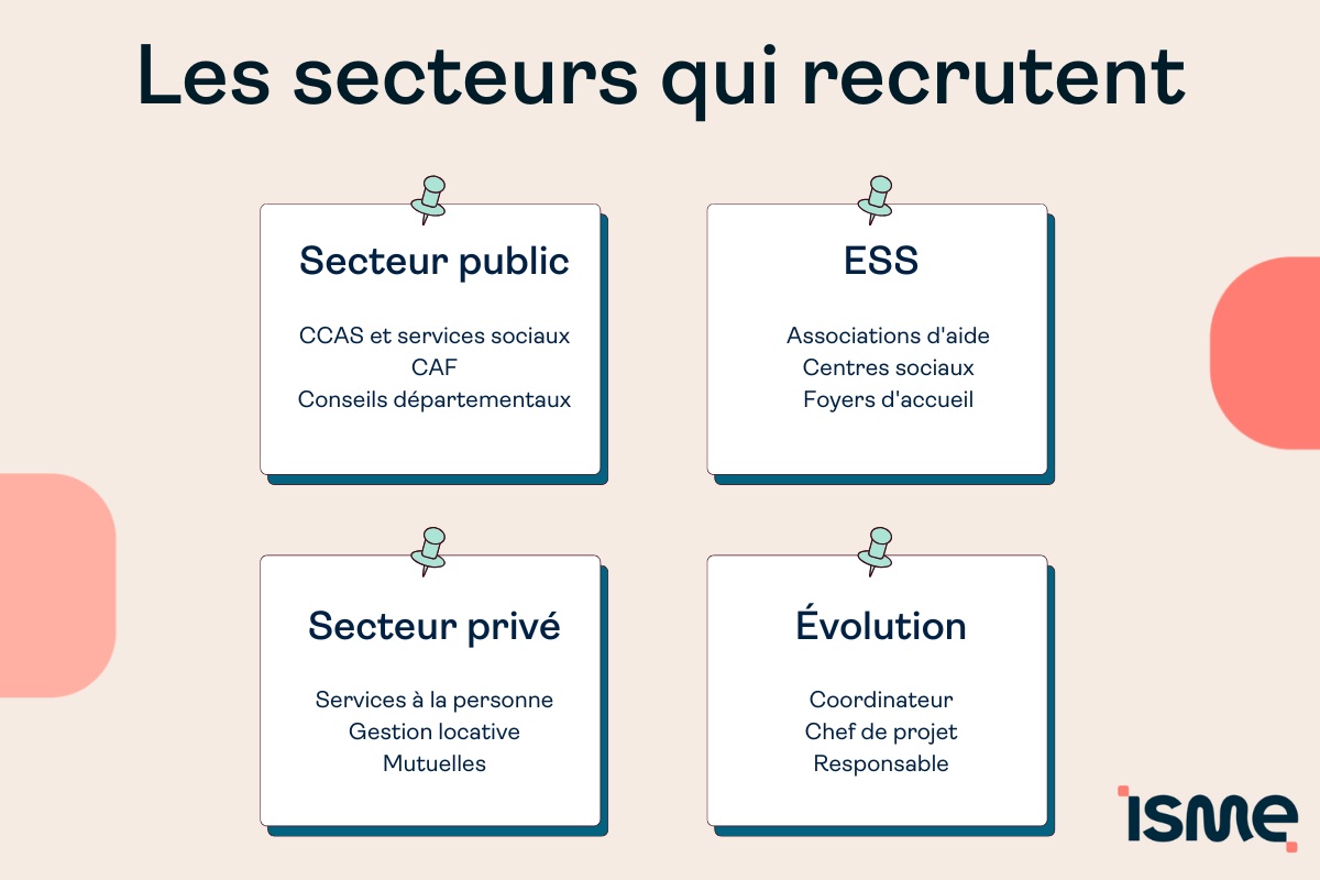 Ton travail s’articule en lien étroit avec les travailleurs sociaux et les éducateurs spécialisés qui suivent déjà ces familles. Les associations d’aide à domicile recrutent massivement sur ce profil, tout comme les services sociaux des collectivités territoriales qui structurent l’accompagnement de proximité.