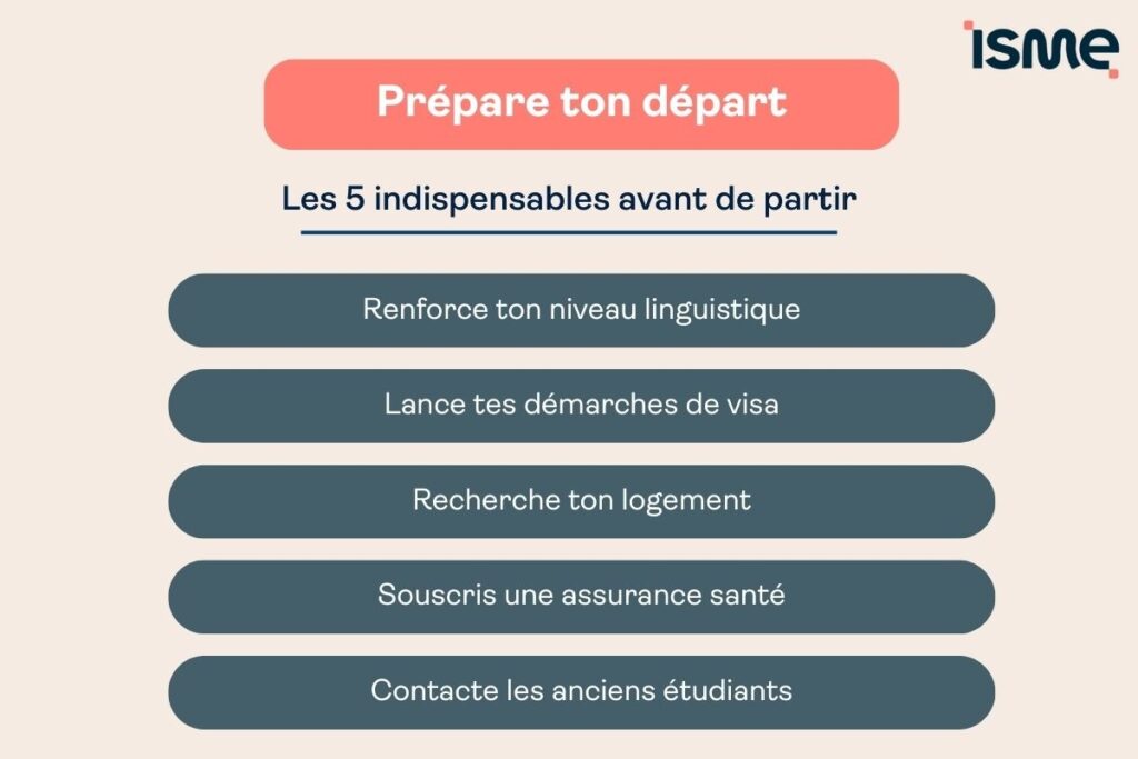 Anticiper ton départ maximise tes chances de réussite. Commence par travailler ton niveau linguistique : cours intensifs et certifications te donnent les bases solides pour suivre tes cours et échanger au quotidien.