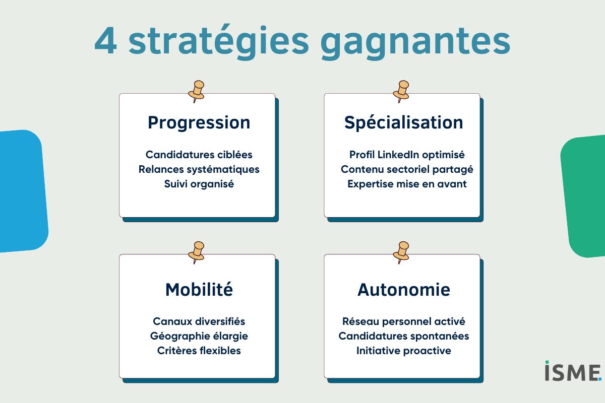 Personnalisez chaque candidature en montrant votre connaissance de l’entreprise et du secteur. Utilise ton réseau personnel et professionnel, active tes contacts ISME et multiplie les candidatures spontanées ciblées. Soigne ta présence LinkedIn et participe aux événements de networking. Ta motivation authentique et ta préparation minutieuse feront la différence.